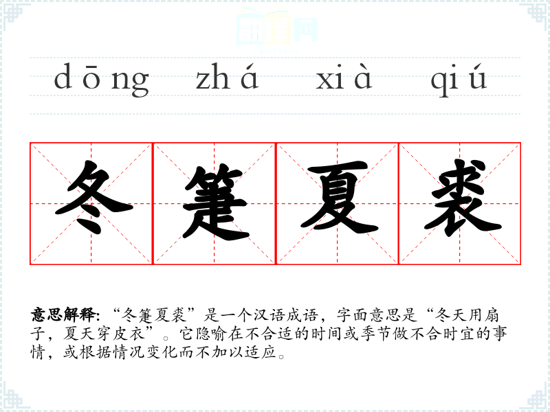 “冬箑夏裘”是一个汉语成语,字面意思是“冬天用扇子,夏天穿皮衣”。它隐喻在不合适的时间或季节做不合时宜的事情,或根据情况变化而不加以适应。