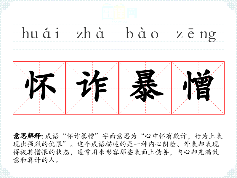 成语“怀诈暴憎”字面意思为“心中怀有欺诈,行为上表现出强烈的仇恨”。这个成语描述的是一种内心阴险、外表却表现得极其憎恨的状态,通常用来形容那些表面上伪善,内心却充满敌意和算计的人。