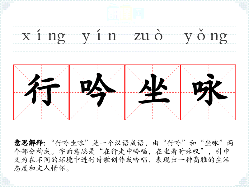 “行吟坐咏”是一个汉语成语,由“行吟”和“坐咏”两个部分构成。字面意思是“在行走中吟唱,在坐着时咏叹”,引申义为在不同的环境中进行诗歌创作或吟唱,表现出一种高雅的生活态度和文人情怀。