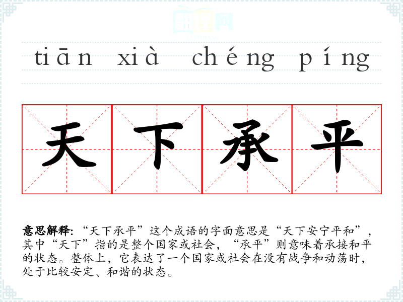 “天下承平”这个成语的字面意思是“天下安宁平和”,其中“天下”指的是整个国家或社会,“承平”则意味着承接和平的状态。整体上,它表达了一个国家或社会在没有战争和动荡时,处于比较安定、和谐的状态。