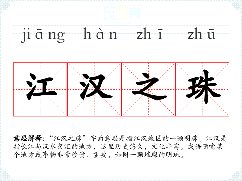 “江汉之珠”字面意思是指江汉地区的一颗明珠。江汉是指长江与汉水交汇的地方,这里历史悠久,文化丰富。成语隐喻某个地方或事物非常珍贵、重要,如同一颗璀璨的明珠。