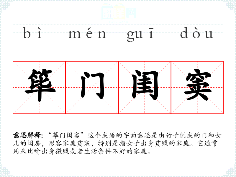 “筚门闺窦”这个成语的字面意思是由竹子制成的门和女儿的闺房,形容家庭贫寒,特别是指女子出身贫贱的家庭。它通常用来比喻出身微贱或者生活条件不好的家庭。