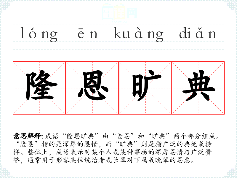 成语“隆恩旷典”由“隆恩”和“旷典”两个部分组成。“隆恩”指的是深厚的恩情,而“旷典”则是指广泛的典范或榜样。整体上,成语表示对某个人或某种事物的深厚恩情与广泛赞誉,通常用于形容某位统治者或长辈对下属或晚辈的恩惠。