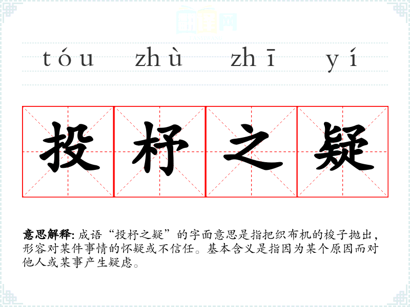成语“投杼之疑”的字面意思是指把织布机的梭子抛出,形容对某件事情的怀疑或不信任。基本含义是指因为某个原因而对他人或某事产生疑虑。