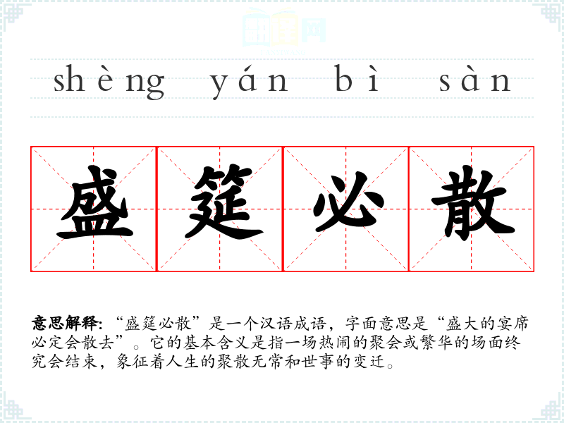 “盛筵必散”是一个汉语成语,字面意思是“盛大的宴席必定会散去”。它的基本含义是指一场热闹的聚会或繁华的场面终究会结束,象征着人生的聚散无常和世事的变迁。