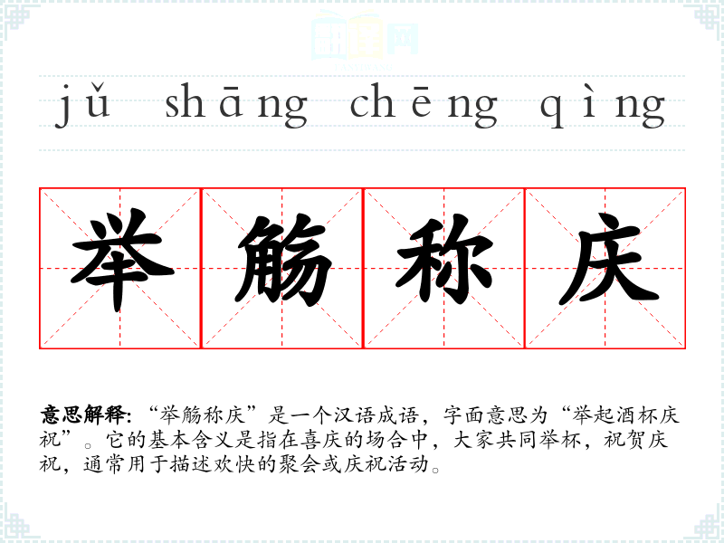 该成语的来源可以追溯到古代的酒宴文化。在古代,酒不仅是饮品,也是社交的重要媒介。在许多文人墨客的作品中,酒宴常常伴随着诗歌、歌唱,成为庆祝的主要形式。“举觞”表示举起酒杯,象征着饮酒祝福的行为,而“称庆”则是表达庆贺的意思。
