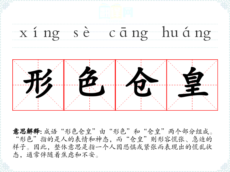 成语“形色仓皇”由“形色”和“仓皇”两个部分组成。“形色”指的是人的表情和神态,而“仓皇”则形容慌张、急迫的样子。因此,整体意思是指一个人因恐惧或紧张而表现出的慌乱状态,通常伴随着焦虑和不安。