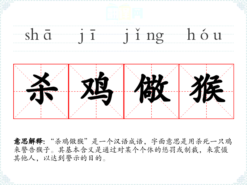 “杀鸡儆猴”是一个汉语成语,字面意思是用杀死一只鸡来警告猴子。其基本含义是通过对某个个体的惩罚或制裁,来震慑其他人,以达到警示的目的。