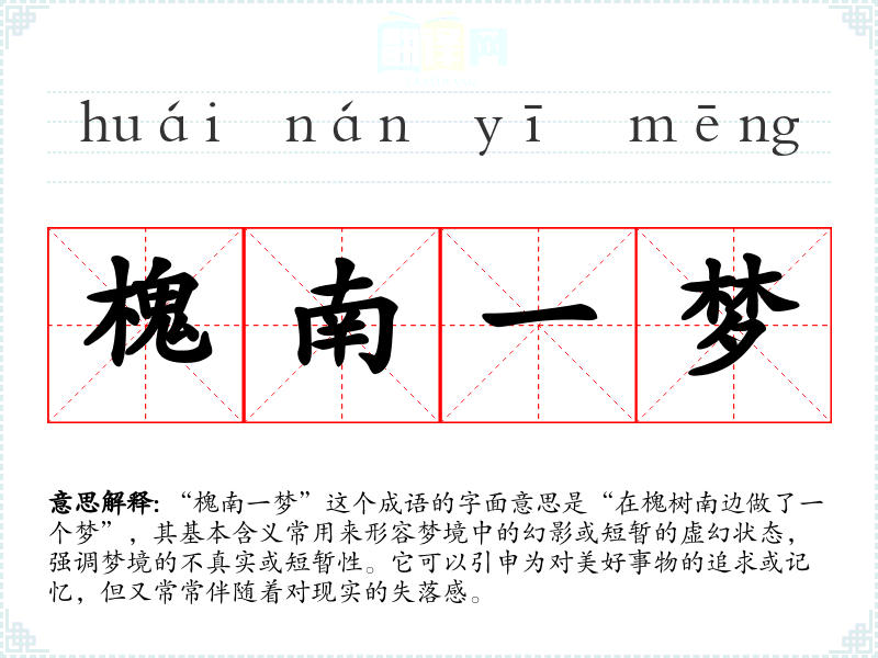 “槐南一梦”这个成语的字面意思是“在槐树南边做了一个梦”,其基本含义常用来形容梦境中的幻影或短暂的虚幻状态,强调梦境的不真实或短暂性。它可以引申为对美好事物的追求或记忆,但又常常伴随着对现实的失落感。