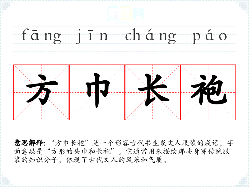 “方巾长袍”是一个形容古代书生或文人服装的成语,字面意思是“方形的头巾和长袍”。它通常用来描绘那些身穿传统服装的知识分子,体现了古代文人的风采和气质。