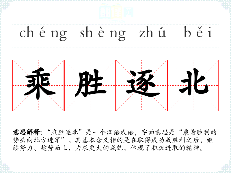 “乘胜逐北”是一个汉语成语,字面意思是“乘着胜利的势头向北方进军”。其基本含义指的是在取得成功或胜利之后,继续努力、趁势而上,力求更大的成就,体现了积极进取的精神。
