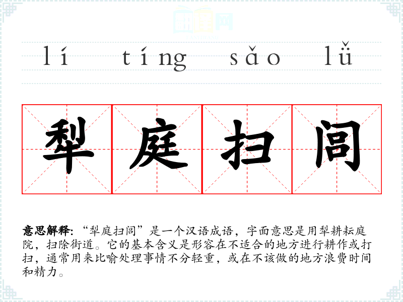 “犁庭扫闾”是一个汉语成语,字面意思是用犁耕耘庭院,扫除街道。它的基本含义是形容在不适合的地方进行耕作或打扫,通常用来比喻处理事情不分轻重,或在不该做的地方浪费时间和精力。