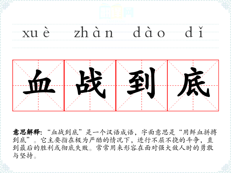 “血战到底”是一个汉语成语,字面意思是“用鲜血拼搏到底”。它主要指在极为严酷的情况下,进行不屈不挠的斗争,直到最后的胜利或彻底失败。常常用来形容在面对强大敌人时的勇敢与坚持。