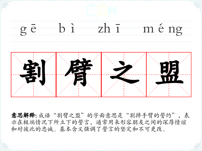 成语“割臂之盟”的字面意思是“割掉手臂的誓约”,表示在极端情况下所立下的誓言,通常用来形容朋友之间的深厚情谊和对彼此的忠诚。基本含义强调了誓言的坚定和不可更改。