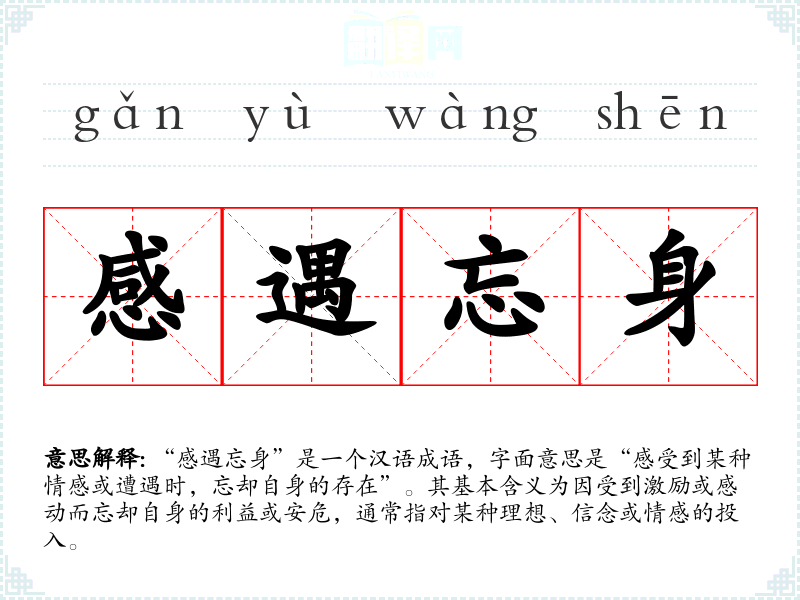 “感遇忘身”是一个汉语成语,字面意思是“感受到某种情感或遭遇时,忘却自身的存在”。其基本含义为因受到激励或感动而忘却自身的利益或安危,通常指对某种理想、信念或情感的投入。