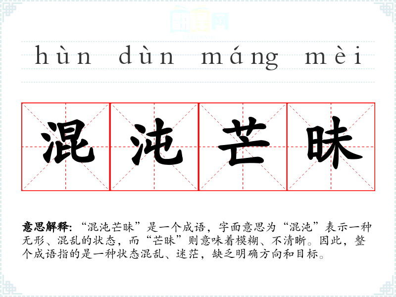 “混沌芒昧”是一个成语,字面意思为“混沌”表示一种无形、混乱的状态,而“芒昧”则意味着模糊、不清晰。因此,整个成语指的是一种状态混乱、迷茫,缺乏明确方向和目标。