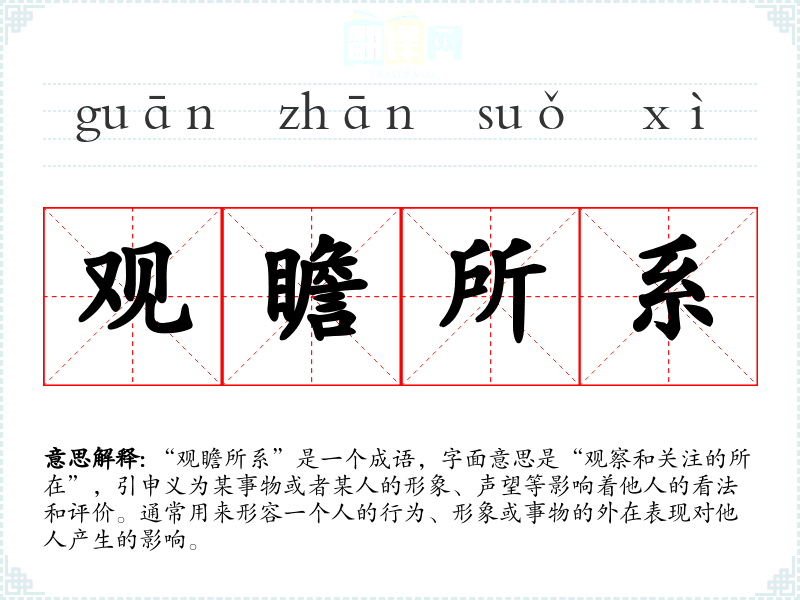 “观瞻所系”是一个成语,字面意思是“观察和关注的所在”,引申义为某事物或者某人的形象、声望等影响着他人的看法和评价。通常用来形容一个人的行为、形象或事物的外在表现对他人产生的影响。