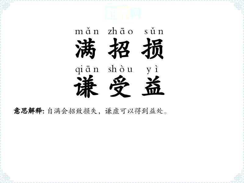 | 谦受益,满招损 | 谦:谦逊,虚心;受:得到;益:好处;满:自满,骄傲;招:招惹;损:损害。自满会招致损失,谦虚可以得到好处。 |