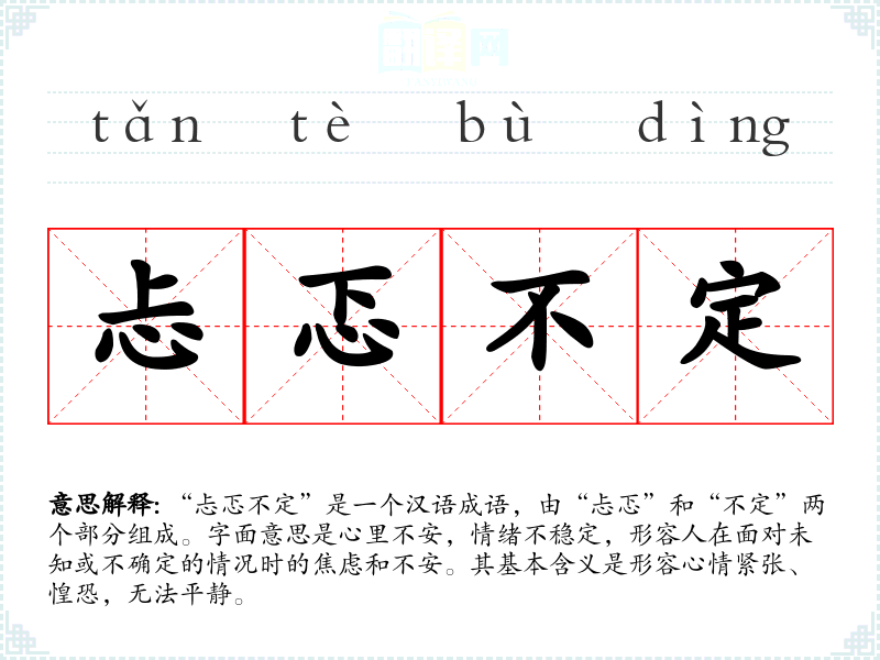 “忐忑”一词本身源于古汉语,最早的引用可以追溯到《礼记》中,意指心中忧虑、动摇不安。成语“忐忑不定”则是在后来的文献中逐渐演变而来,常用于形容人在面临未知或重要事情时的心态。它的使用在近现代文学作品中逐渐普及。