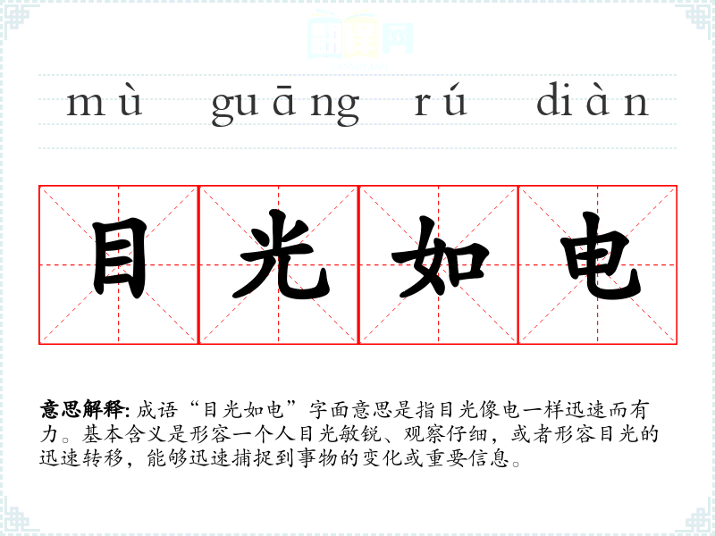 成语“目光如电”字面意思是指目光像电一样迅速而有力。基本含义是形容一个人目光敏锐、观察仔细,或者形容目光的迅速转移,能够迅速捕捉到事物的变化或重要信息。