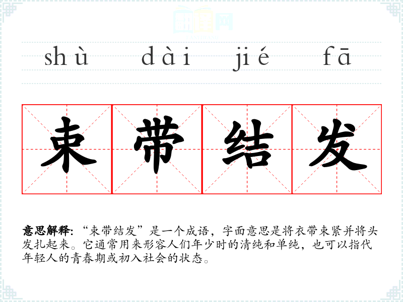 “束带结发”是一个成语,字面意思是将衣带束紧并将头发扎起来。它通常用来形容人们年少时的清纯和单纯,也可以指代年轻人的青春期或初入社会的状态。