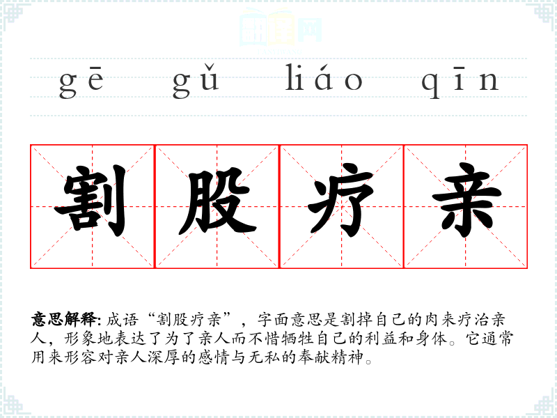 | 割股疗亲 | 股:大腿。旧指孝子割舍自己腿上的肉来治疗父母的疾病。 |