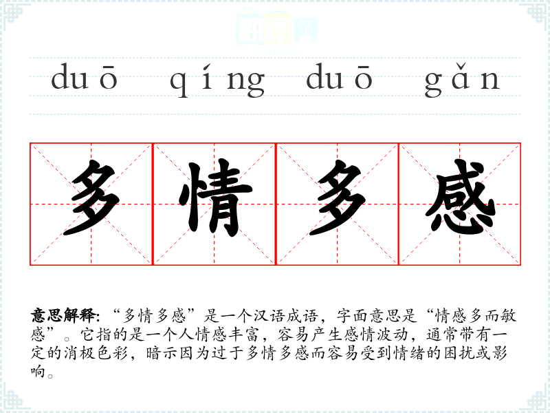 “多情多感”是一个汉语成语,字面意思是“情感多而敏感”。它指的是一个人情感丰富,容易产生感情波动,通常带有一定的消极色彩,暗示因为过于多情多感而容易受到情绪的困扰或影响。