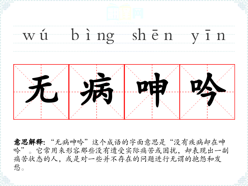 “无病呻吟”这个成语的字面意思是“没有疾病却在呻吟”。它常用来形容那些没有遭受实际痛苦或困扰,却表现出一副痛苦状态的人,或是对一些并不存在的问题进行无谓的抱怨和发愁。