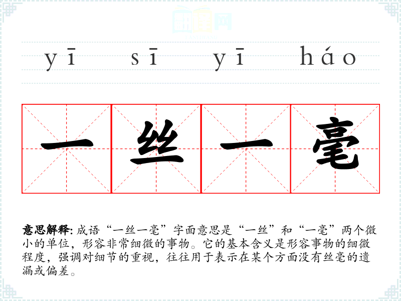 成语“一丝一毫”字面意思是“一丝”和“一毫”两个微小的单位,形容非常细微的事物。它的基本含义是形容事物的细微程度,强调对细节的重视,往往用于表示在某个方面没有丝毫的遗漏或偏差。