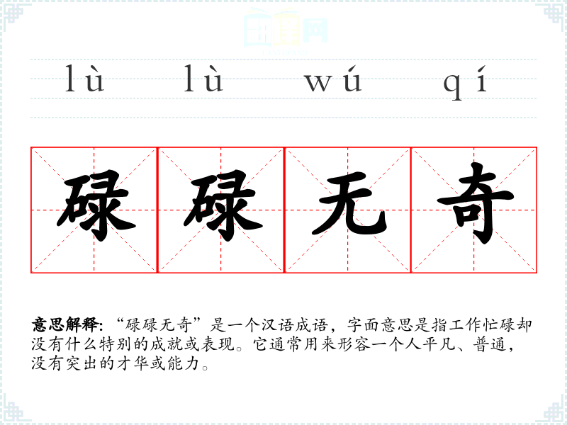 “碌碌无奇”是一个汉语成语,字面意思是指工作忙碌却没有什么特别的成就或表现。它通常用来形容一个人平凡、普通,没有突出的才华或能力。