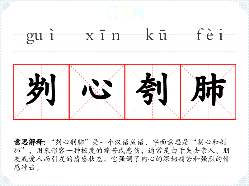 在英语中,类似表达情感痛苦的短语有“broken-hearted”,虽然含义相近,但“broken-hearted”更多侧重于失去爱情的痛苦,而“刿心刳肺”则更广泛地适用于任何深切的情感损失。