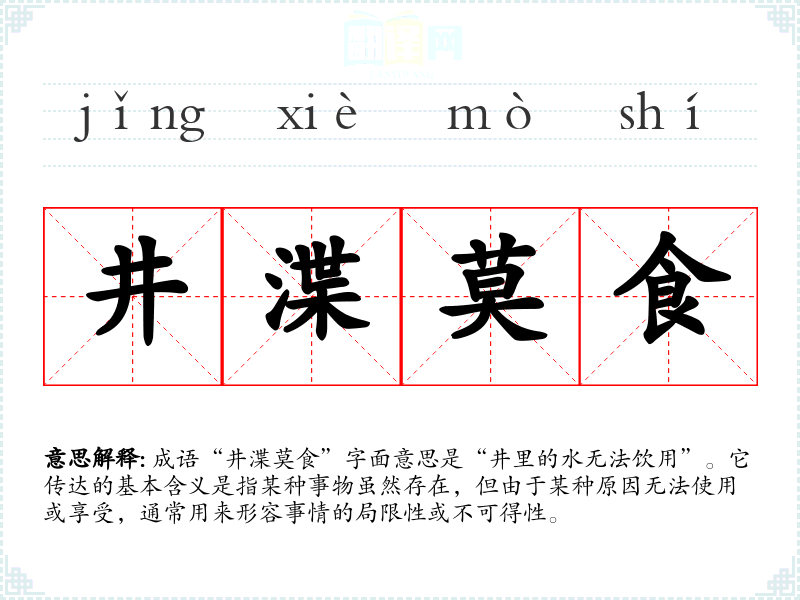 成语“井渫莫食”字面意思是“井里的水无法饮用”。它传达的基本含义是指某种事物虽然存在,但由于某种原因无法使用或享受,通常用来形容事情的局限性或不可得性。