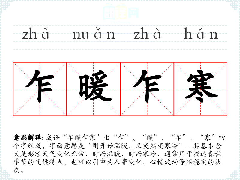 成语“乍暖乍寒”由“乍”、“暖”、“乍”、“寒”四个字组成,字面意思是“刚开始温暖,又突然变寒冷”。其基本含义是形容天气变化无常,时而温暖,时而寒冷,通常用于描述春秋季节的气候特点,也可以引申为人事变化、心情波动等不稳定的状态。