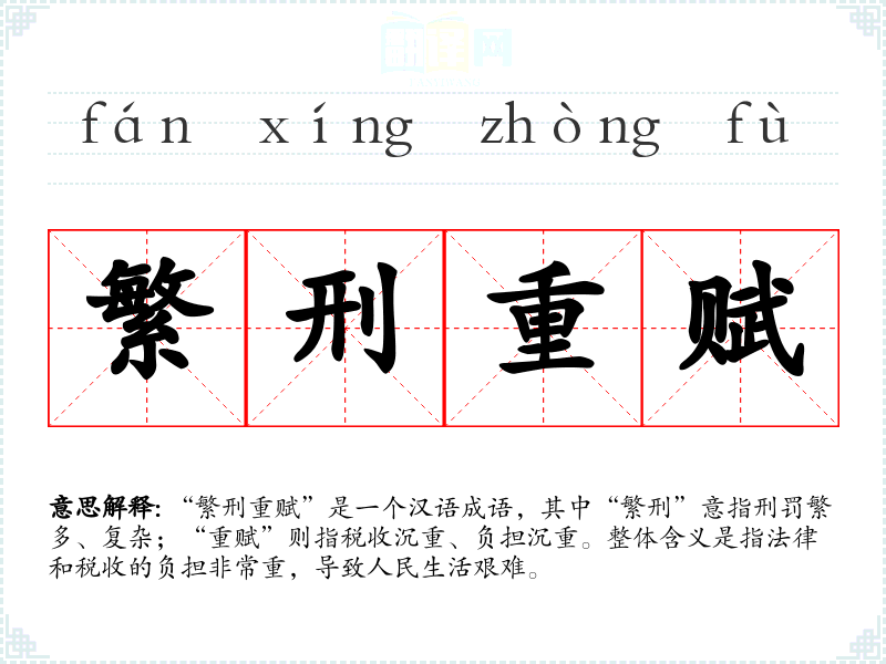 “繁刑重赋”是一个汉语成语,其中“繁刑”意指刑罚繁多、复杂;“重赋”则指税收沉重、负担沉重。整体含义是指法律和税收的负担非常重,导致人民生活艰难。