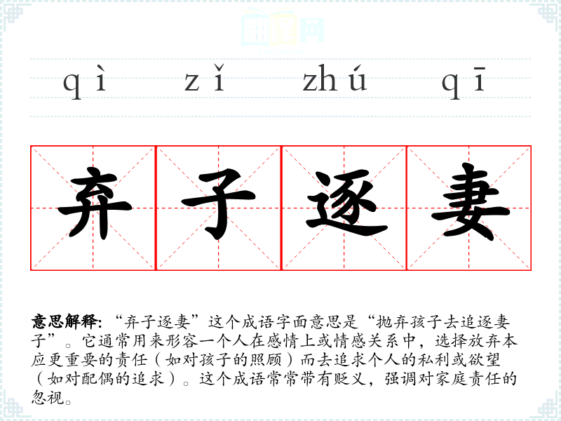 “弃子逐妻”这个成语字面意思是“抛弃孩子去追逐妻子”。它通常用来形容一个人在感情上或情感关系中,选择放弃本应更重要的责任(如对孩子的照顾)而去追求个人的私利或欲望(如对配偶的追求)。这个成语常常带有贬义,强调对家庭责任的忽视。