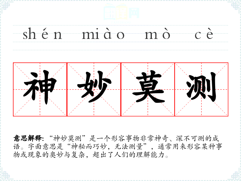 “神妙莫测”是一个形容事物非常神奇、深不可测的成语。字面意思是“神秘而巧妙,无法测量”,通常用来形容某种事物或现象的奥妙与复杂,超出了人们的理解能力。