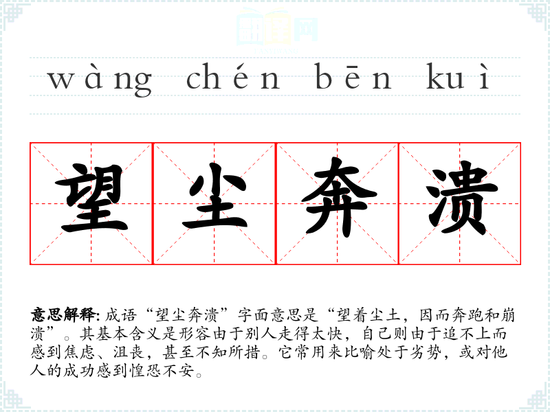 成语“望尘奔溃”字面意思是“望着尘土,因而奔跑和崩溃”。其基本含义是形容由于别人走得太快,自己则由于追不上而感到焦虑、沮丧,甚至不知所措。它常用来比喻处于劣势,或对他人的成功感到惶恐不安。