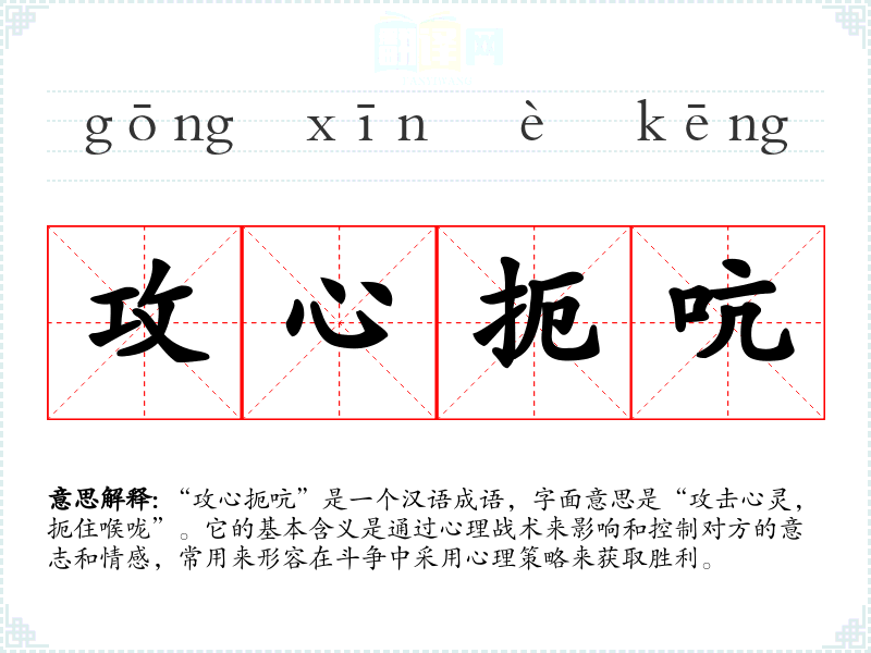 “攻心扼吭”是一个汉语成语,字面意思是“攻击心灵,扼住喉咙”。它的基本含义是通过心理战术来影响和控制对方的意志和情感,常用来形容在斗争中采用心理策略来获取胜利。