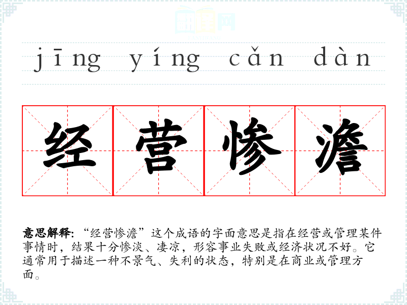 “经营惨澹”这个成语的字面意思是指在经营或管理某件事情时,结果十分惨淡、凄凉,形容事业失败或经济状况不好。它通常用于描述一种不景气、失利的状态,特别是在商业或管理方面。