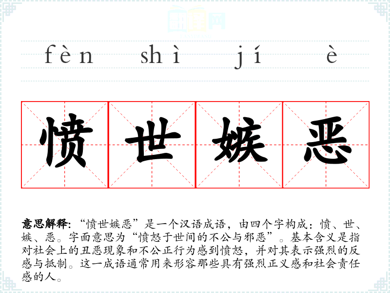 | 愤世嫉俗 | 愤:憎恶,痛恨;嫉:仇恨,痛恨;世、俗:当时的社会状况。有正义感的人对黑暗的现实社会和不合理的习俗表示愤恨、憎恶。 |