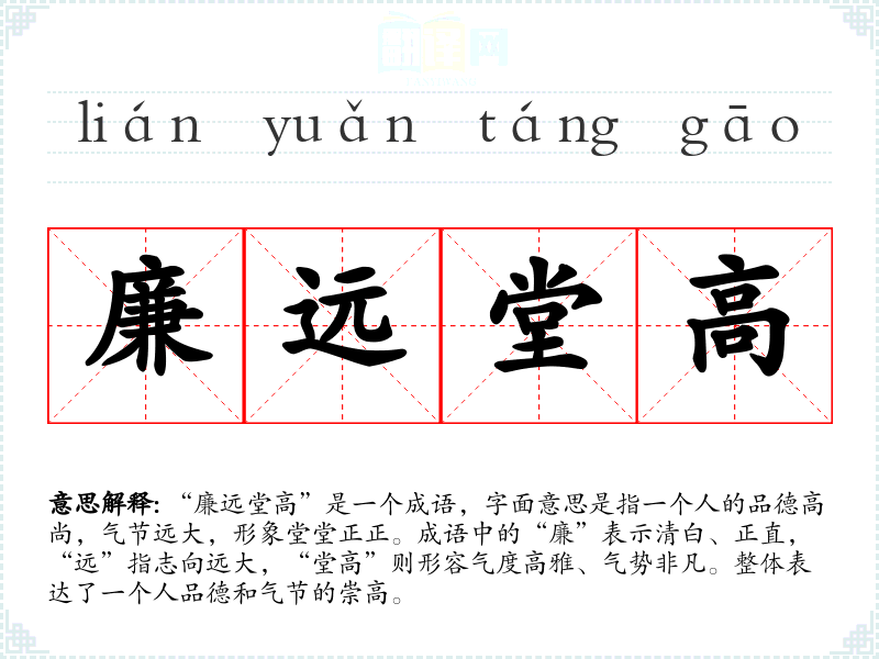 “廉远堂高”是一个成语,字面意思是指一个人的品德高尚,气节远大,形象堂堂正正。成语中的“廉”表示清白、正直,“远”指志向远大,“堂高”则形容气度高雅、气势非凡。整体表达了一个人品德和气节的崇高。