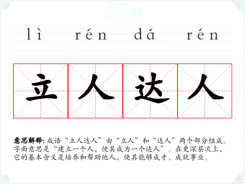 成语“立人达人”由“立人”和“达人”两个部分组成。字面意思是“建立一个人,使其成为一个达人”。在更深层次上,它的基本含义是培养和帮助他人,使其能够成才、成就事业。