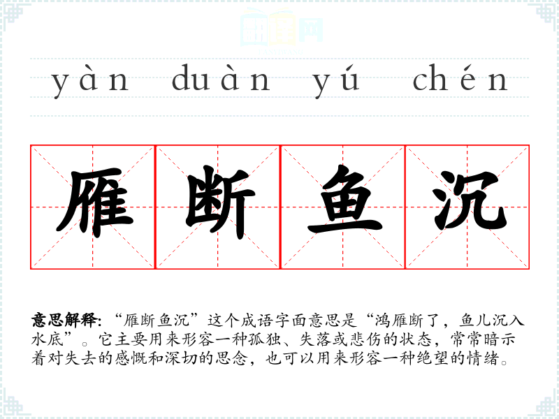 “雁断鱼沉”这个成语字面意思是“鸿雁断了,鱼儿沉入水底”。它主要用来形容一种孤独、失落或悲伤的状态,常常暗示着对失去的感慨和深切的思念,也可以用来形容一种绝望的情绪。