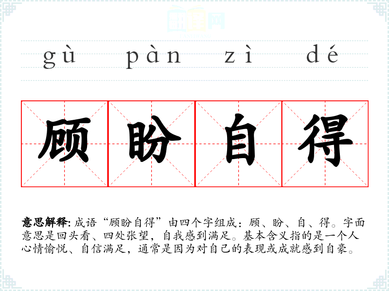成语“顾盼自得”由四个字组成:顾、盼、自、得。字面意思是回头看、四处张望,自我感到满足。基本含义指的是一个人心情愉悦、自信满足,通常是因为对自己的表现或成就感到自豪。