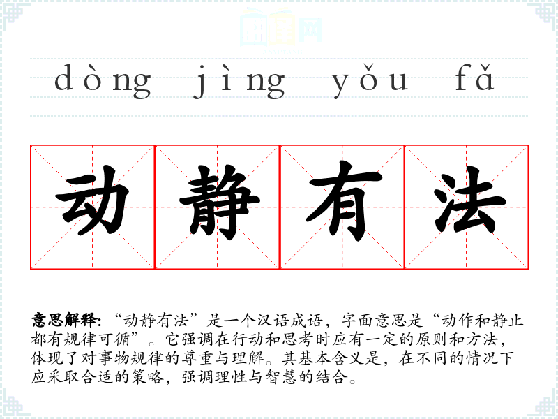 “动静有法”是一个汉语成语,字面意思是“动作和静止都有规律可循”。它强调在行动和思考时应有一定的原则和方法,体现了对事物规律的尊重与理解。其基本含义是,在不同的情况下应采取合适的策略,强调理性与智慧的结合。