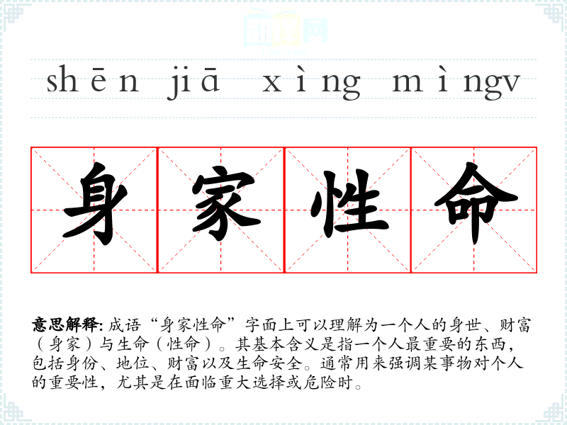 成语“身家性命”字面上可以理解为一个人的身世、财富(身家)与生命(性命)。其基本含义是指一个人最重要的东西,包括身份、地位、财富以及生命安全。通常用来强调某事物对个人的重要性,尤其是在面临重大选择或危险时。