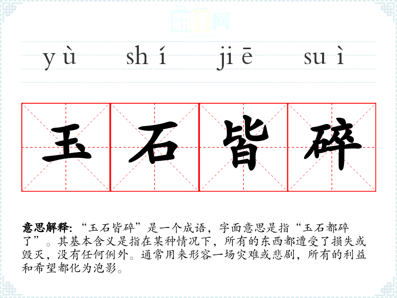 在**文化中,玉石常被视为美好、珍贵和坚韧的象征。因此,“玉石皆碎”不仅传达了物质的毁灭,也意味着希望和美好的破灭。在现代社会,该成语可以用来描述社会的动荡、经济的崩溃等情景,依然具有其适用性。