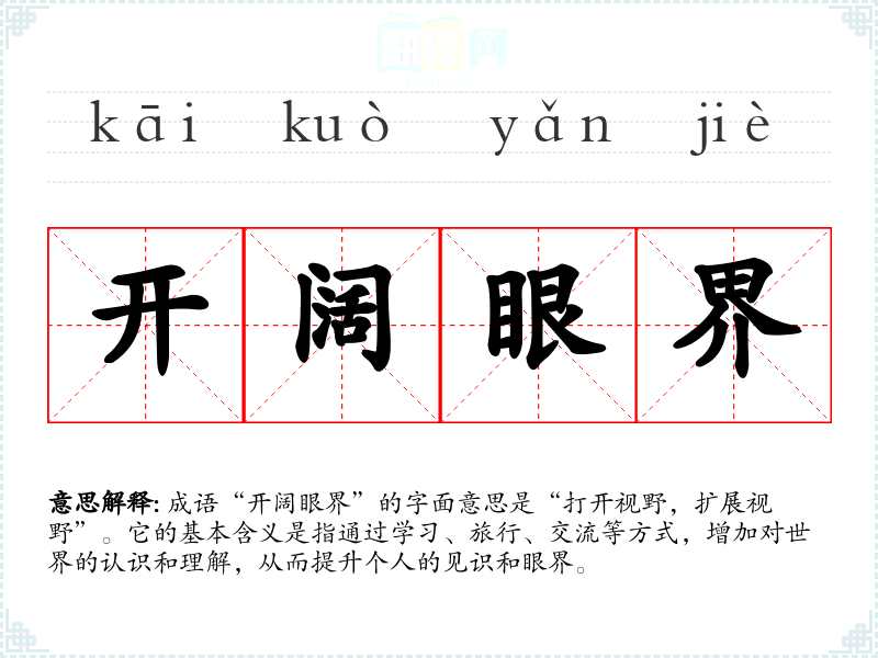 成语“开阔眼界”的字面意思是“打开视野,扩展视野”。它的基本含义是指通过学习、旅行、交流等方式,增加对世界的认识和理解,从而提升个人的见识和眼界。