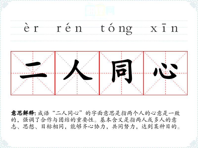 成语“二人同心”的字面意思是指两个人的心意是一致的,强调了合作与团结的重要性。基本含义是指两人或多人的意志、思想、目标相同,能够齐心协力,共同努力,达到某种目的。