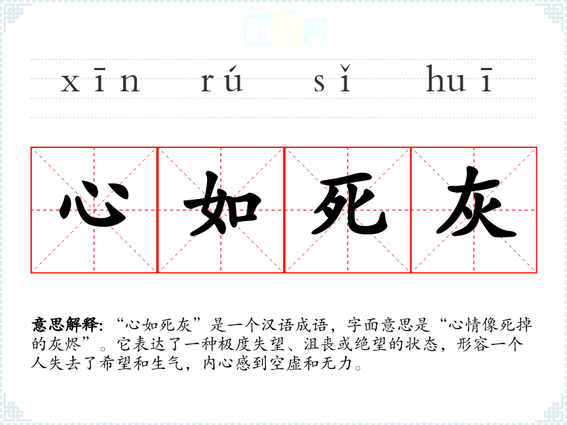 “心如死灰”是一个汉语成语,字面意思是“心情像死掉的灰烬”。它表达了一种极度失望、沮丧或绝望的状态,形容一个人失去了希望和生气,内心感到空虚和无力。